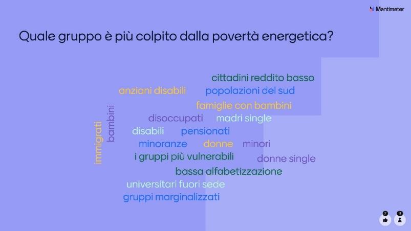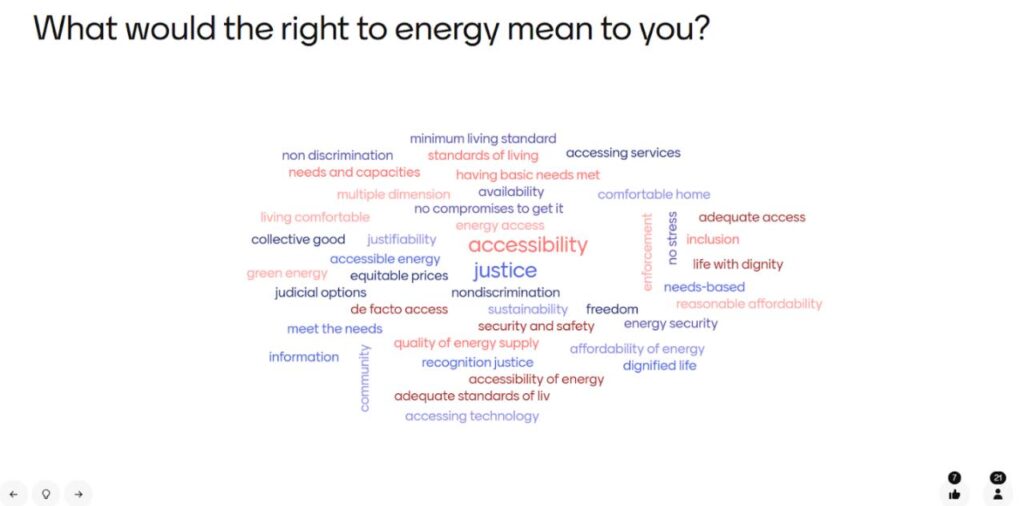 Use of interactive polling during the sessions captured the audiences’ reflections on questions such as: What words do you associate with energy vulnerability? What groups in your country are affected by energy vulnerability? What would the right to energy mean to you?